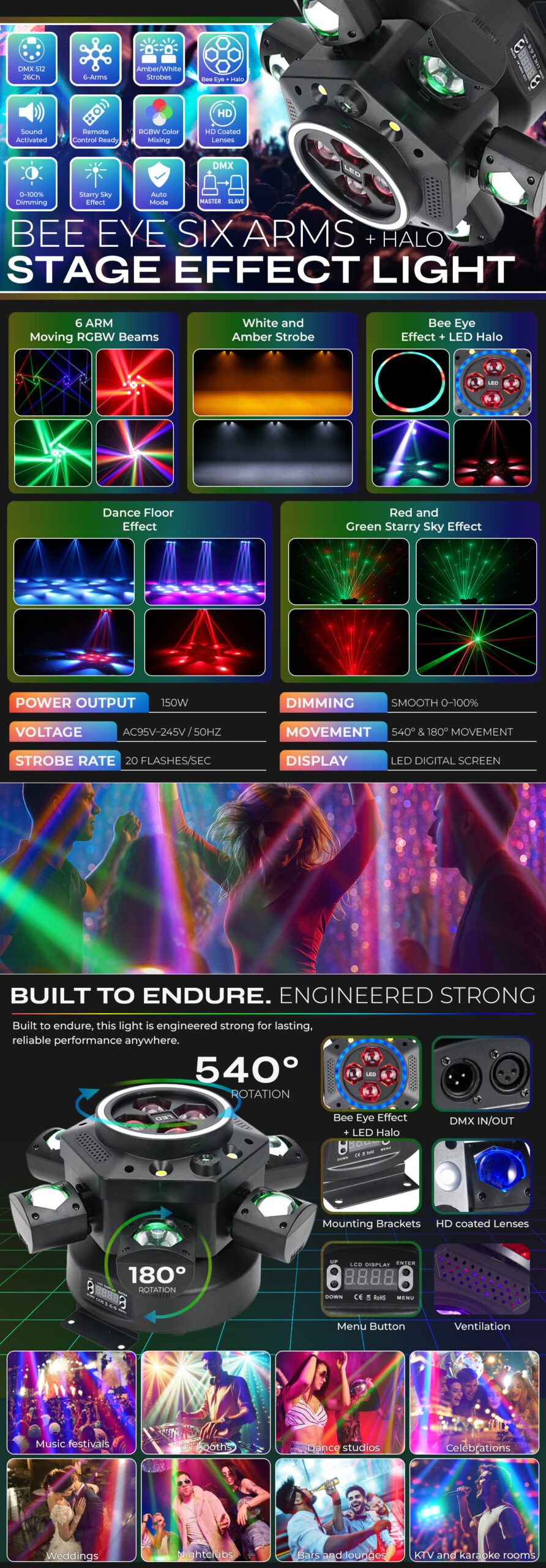 Additional functionality includes a sound-activated mode, enabling the unit to respond dynamically to music. This automatic feature is perfect for DJs and musicians, creating immersive live experiences with minimal effort. Whether for mobile gigs, club nights, stage productions, or other entertainment venues, you’ll appreciate every moment of the smooth integration of light and sound.